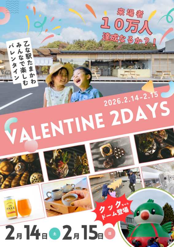 イベント EVENT2026.01.25VALENTINE 2DAYS -みんなで楽しむバレンタイン-(2/14~2/15)乙な駅たまかわで、みんなで楽しめるバレンタインイベントを開催します。ご家族やご友人と一緒に、あたたかなひとときをお過ごしください。開催概要開催日時:2月14日(土)・2月15日(日)会場:乙な駅たまかわ限定メニュー・バレンタインオリジナルパン「チョコっと恋をしてみました」・バレンタインパフェ&オッジパフェお得情報・凍頂ウーロン茶 ペア割・ギフト用メッセージカード配布(※クラフトビール購入者限定)スペシャルイベント・ふわふわクックちゃんドーム登場・カヌーづくり体験