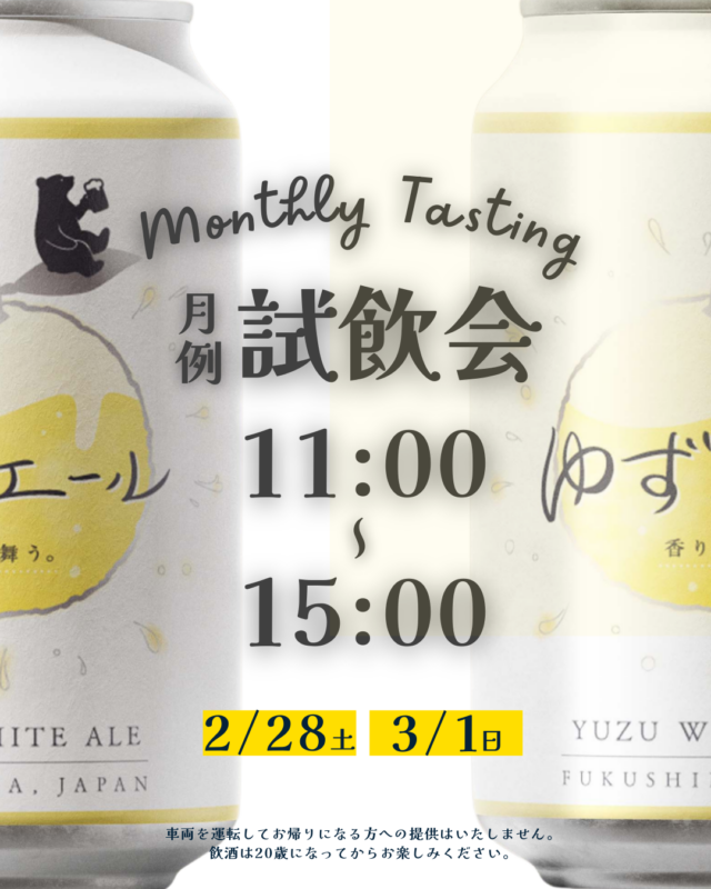 イベント EVENT2026.02.23クラフトビール試飲会2月28日(土)・3月1日(日)11:00〜15:00乙な駅たまかわ内クラフトビール試飲会を開催します。3月発売の福島県産ゆずを使用した「ゆずエール」はもちろん、販売中の商品も試飲いただけます。気になっていた銘柄を、この機会にぜひお試しください。※20歳以上の方のみご参加いただけます。※飲酒運転は法律で禁止されています。