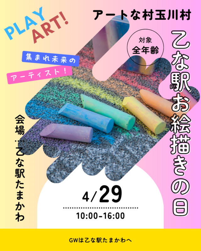 イベント EVENT2026.04.26乙な駅お絵描きの日開催 4/29【乙な駅お絵描きの日】4月19日(水・祝)10:00~16:00地面いっぱいに、自由に描こう。小さな落書きも、大きな作品も。子どもも大人も、だれでも参加できます。色であそぶ一日。描いて、笑って、また描いて。乙な駅たまかわで、皆さまのご来場をお待ちしております。